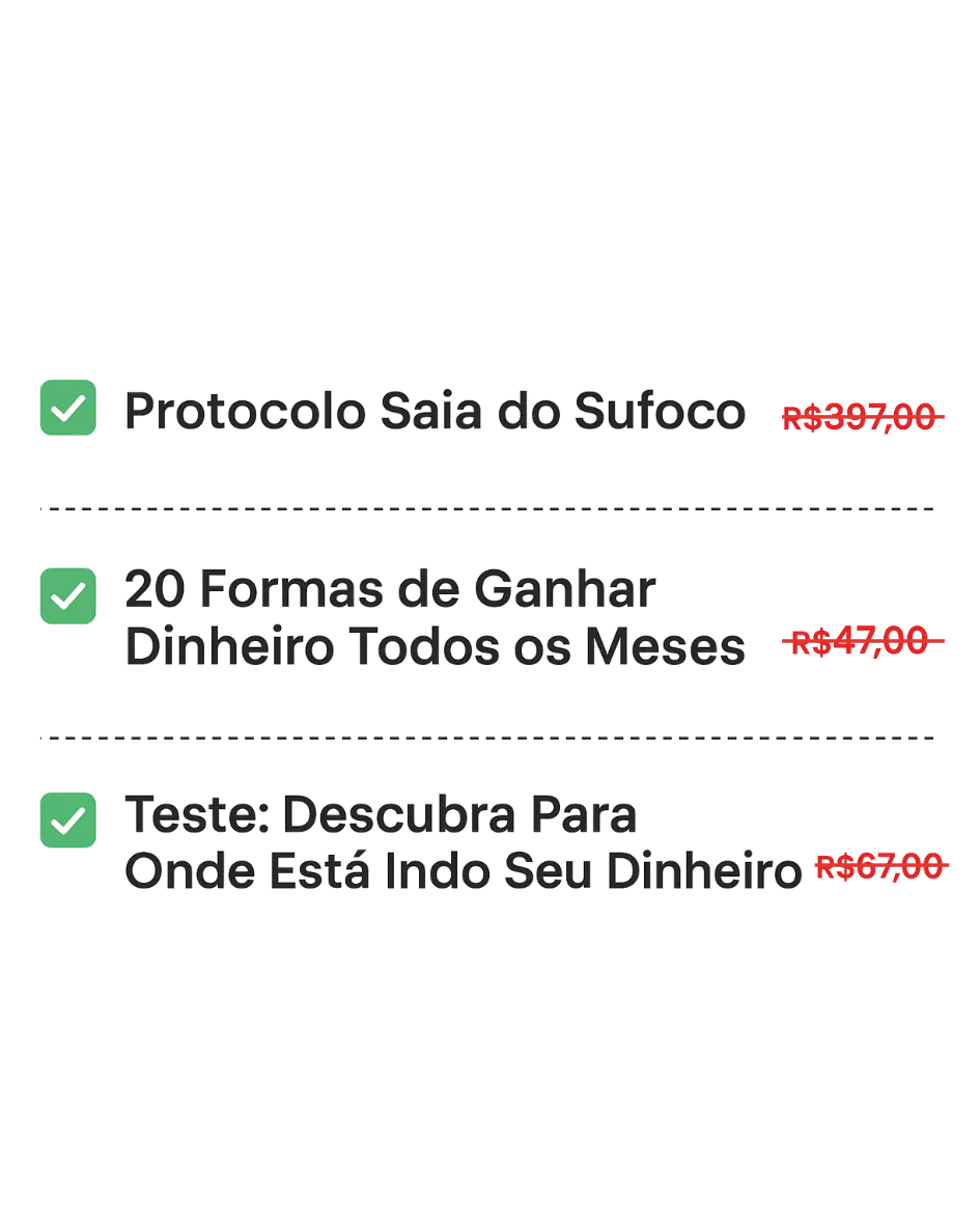 Investir apenas R$ 67,00 para descobrir o que está te fazendo ficar sempre no sufoco e receber um protocolo que vai fazer você se libertar e ter dinheiro sobrando todo mês